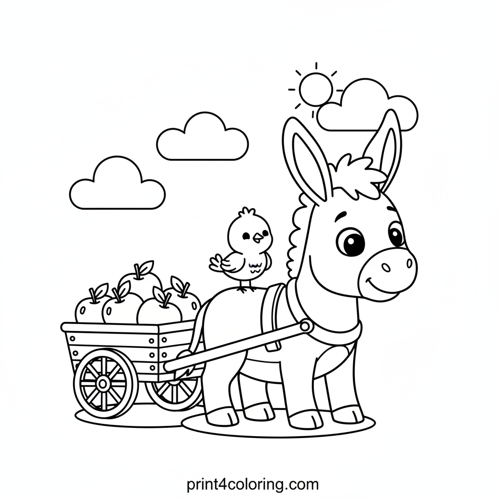 Meet a cheerful donkey carefully pulling a small, wheeled cart overflowing with big, round apples! A friendly little bird perches happily on his back, supervising the delicious harvest. This heartwarming farm scene is ready for your vibrant colors. Bring this apple-picking adventure to life!
