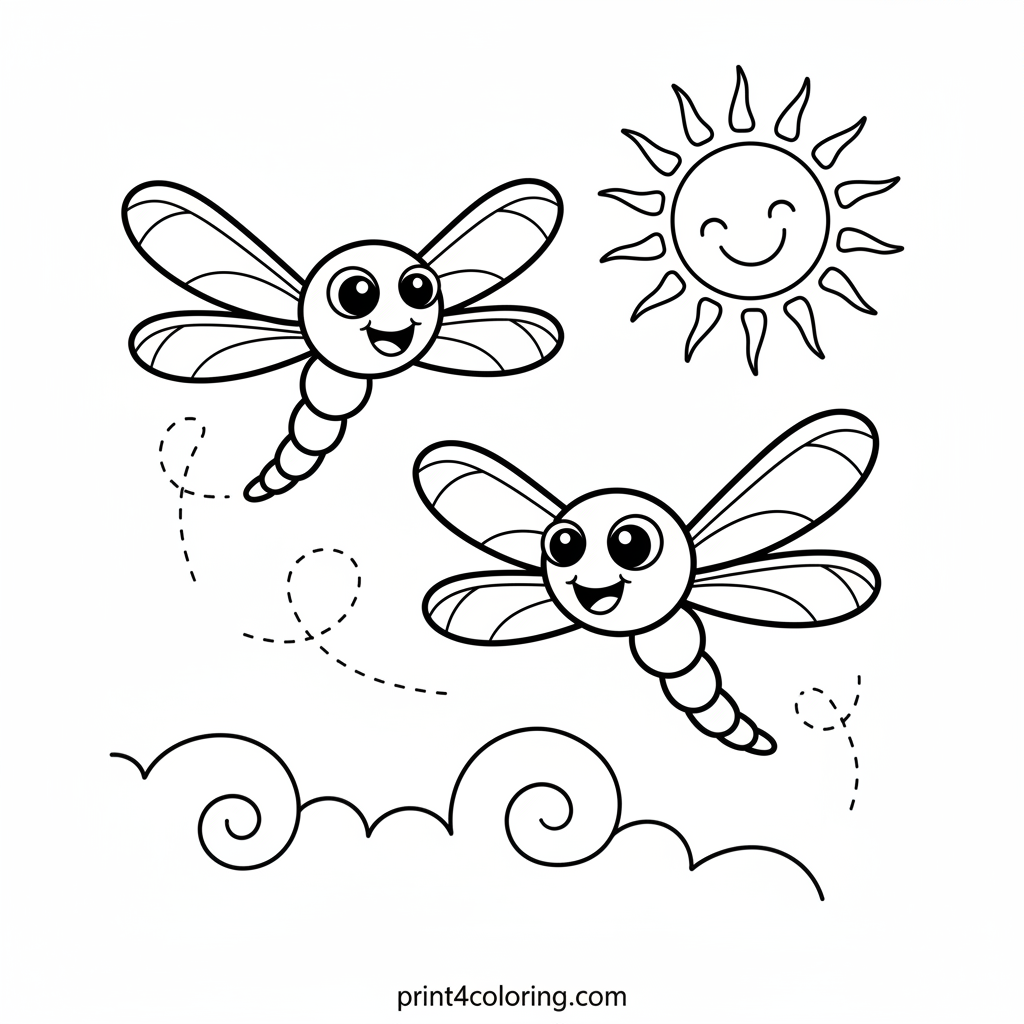 Soar into fun with two cheerful dragonflies as they perform amazing aerial stunts! Watch these happy insects zip and loop through a bright, sunny sky, leaving simple, curved trails of joy behind them. With wide smiles, they invite you to bring their playful world to life with all your favorite colors. Get ready for some high-flying coloring adventure!