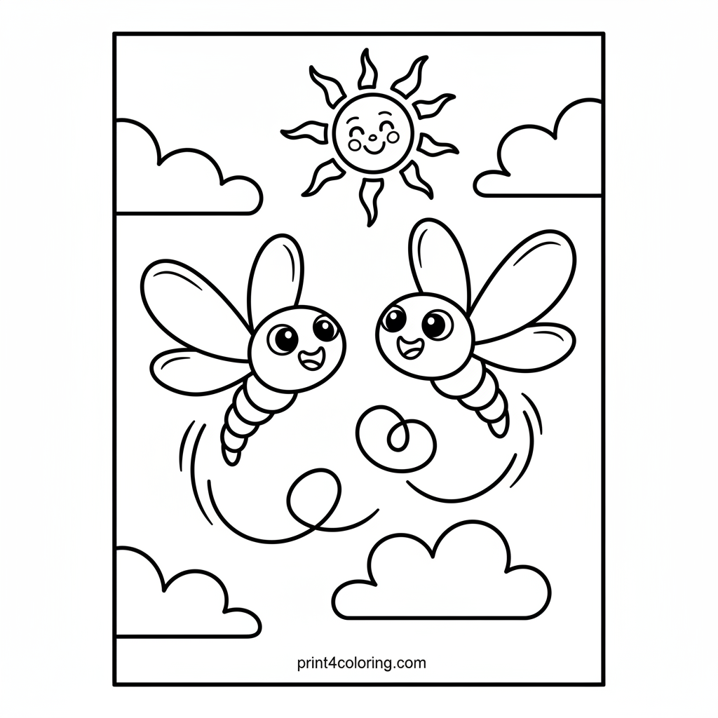 Watch two cheerful dragonflies as they perform amazing aerial tricks! With wide smiles, they zoom, loop, and twirl through the bright, sunny sky, leaving behind fun, curved trails. This easy coloring page is perfect for little artists to bring these happy insects to life with vibrant colors and imaginative flair.