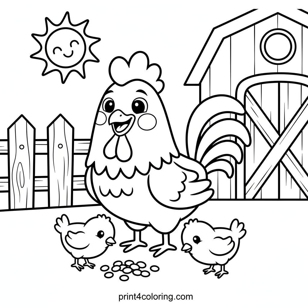 Join a kind rooster and his two adorable, fluffy chicks as they enjoy a delicious pile of happy seeds in a bright, sunny barnyard. This heartwarming scene captures the joy of friendship and sharing on the farm. Perfect for little artists to bring to life with their favorite colors.