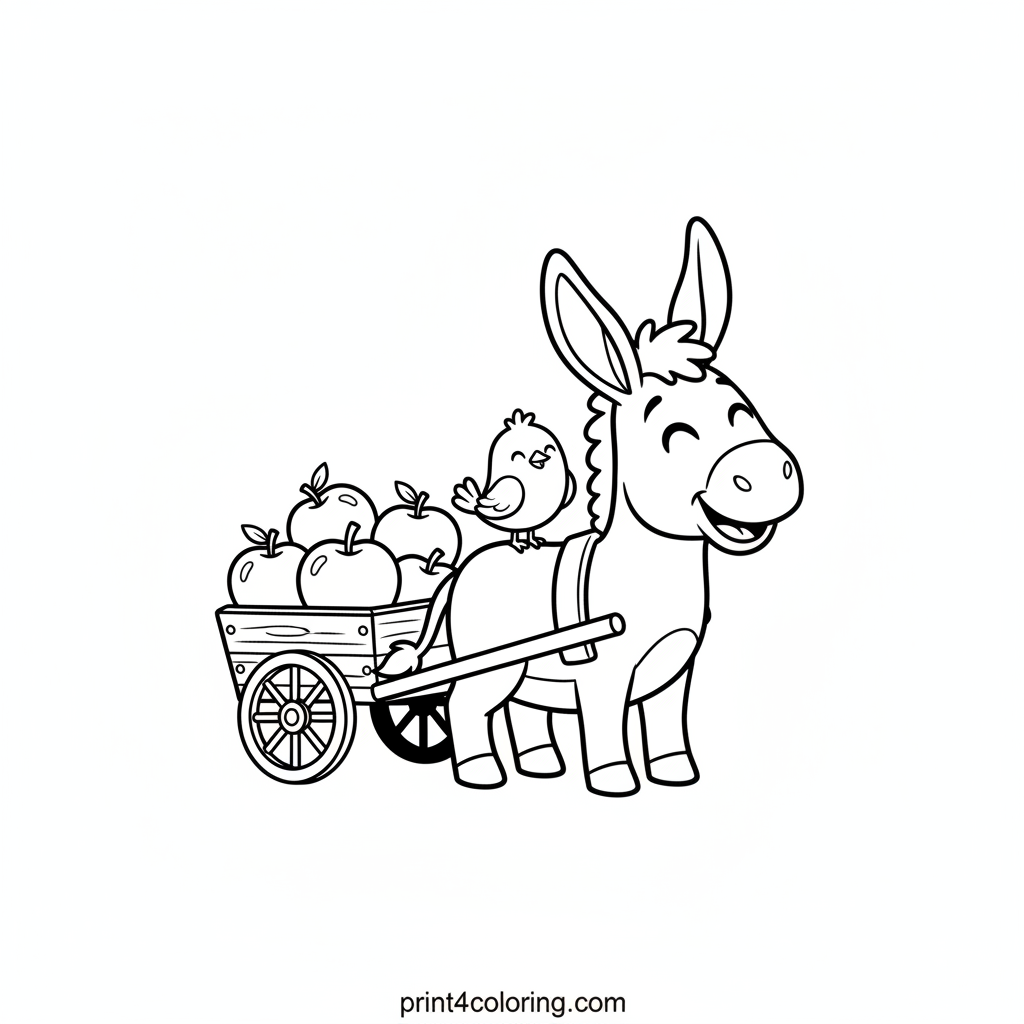Join a cheerful donkey as it helps with the apple harvest! This friendly animal is carefully pulling a small, wheeled cart piled high with big, juicy, round apples. A tiny, happy bird is perched gently on the donkey's back, enjoying the ride. A delightful scene perfect for little artists to bring to life with their favorite colors!