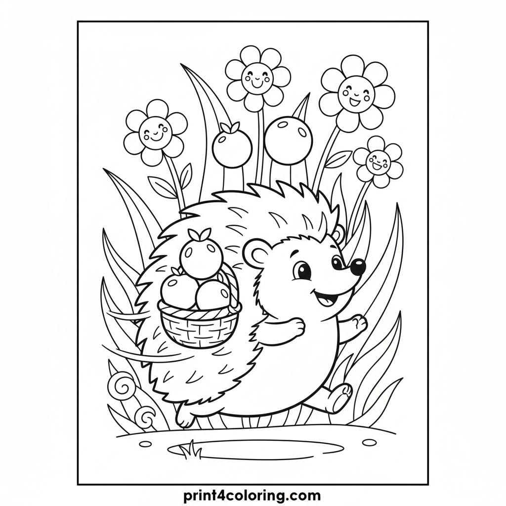 Join a cheerful hedgehog on an exciting dash through a vibrant field! With a friendly smile, this speedy little creature is on a mission, carrying a tiny basket of juicy berries gently bouncing on its back. Tall, wavy grass and simple wildflowers line its path, creating a delightful scene perfect for young artists to bring to life with their favorite colors.