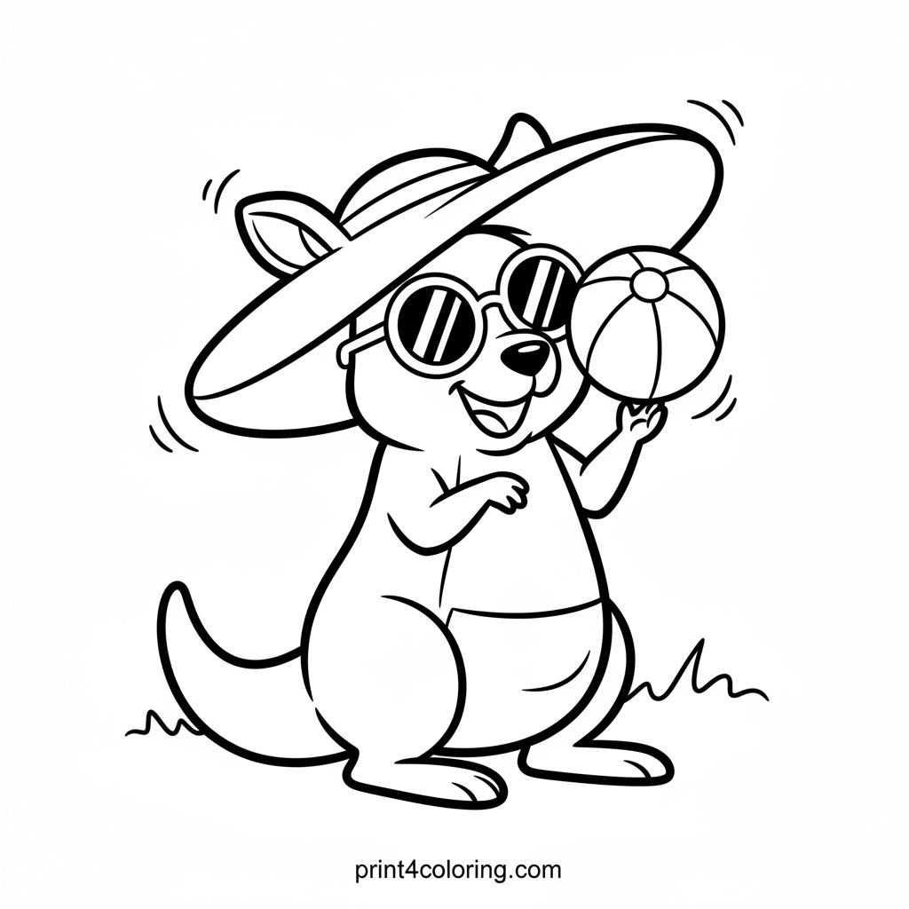 Hop into fun with this super silly kangaroo! Our cheerful friend is ready for a beach day, wearing a huge floppy sun hat and cool sunglasses. See it grin widely, balancing a colorful beach ball on its nose. Grab your crayons and bring this sunny scene to life!