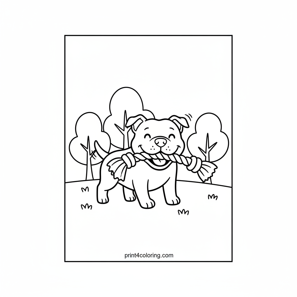 Join a friendly pitbull dog as it enjoys a lively game of tug-of-war with its favorite soft rope toy! This happy pup is having so much fun in the park, surrounded by simple trees and green grass. Grab your crayons and bring this joyful scene to life!