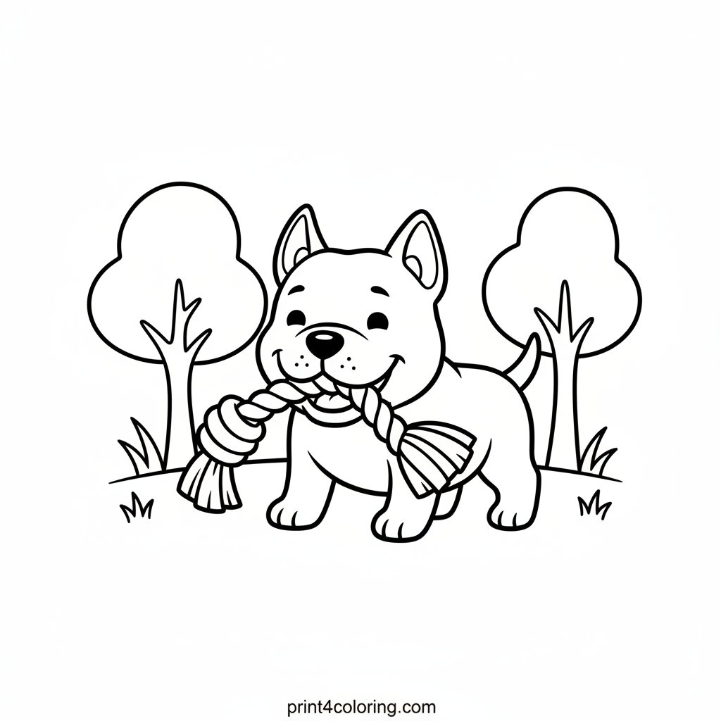 Get ready for a joyful park playdate! A happy pitbull is having the best time playing tug-of-war with a soft rope toy. Simple trees and green grass set the scene for this fun outdoor adventure. Use your favorite colors to bring this playful dog and its exciting game to life!
