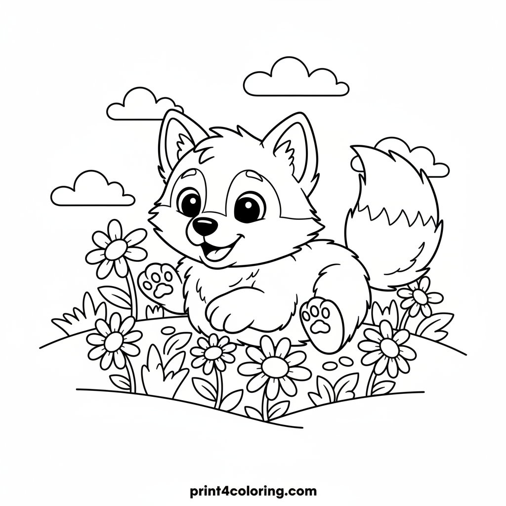 Get ready to color a fluffy wolf pup, its big, friendly eyes full of joy, as it happily rolls in a sunny field of white daisies! Its tail wags with pure delight, inviting you to add vibrant colors to this adorable, playful scene. Bring this happy pup to life!