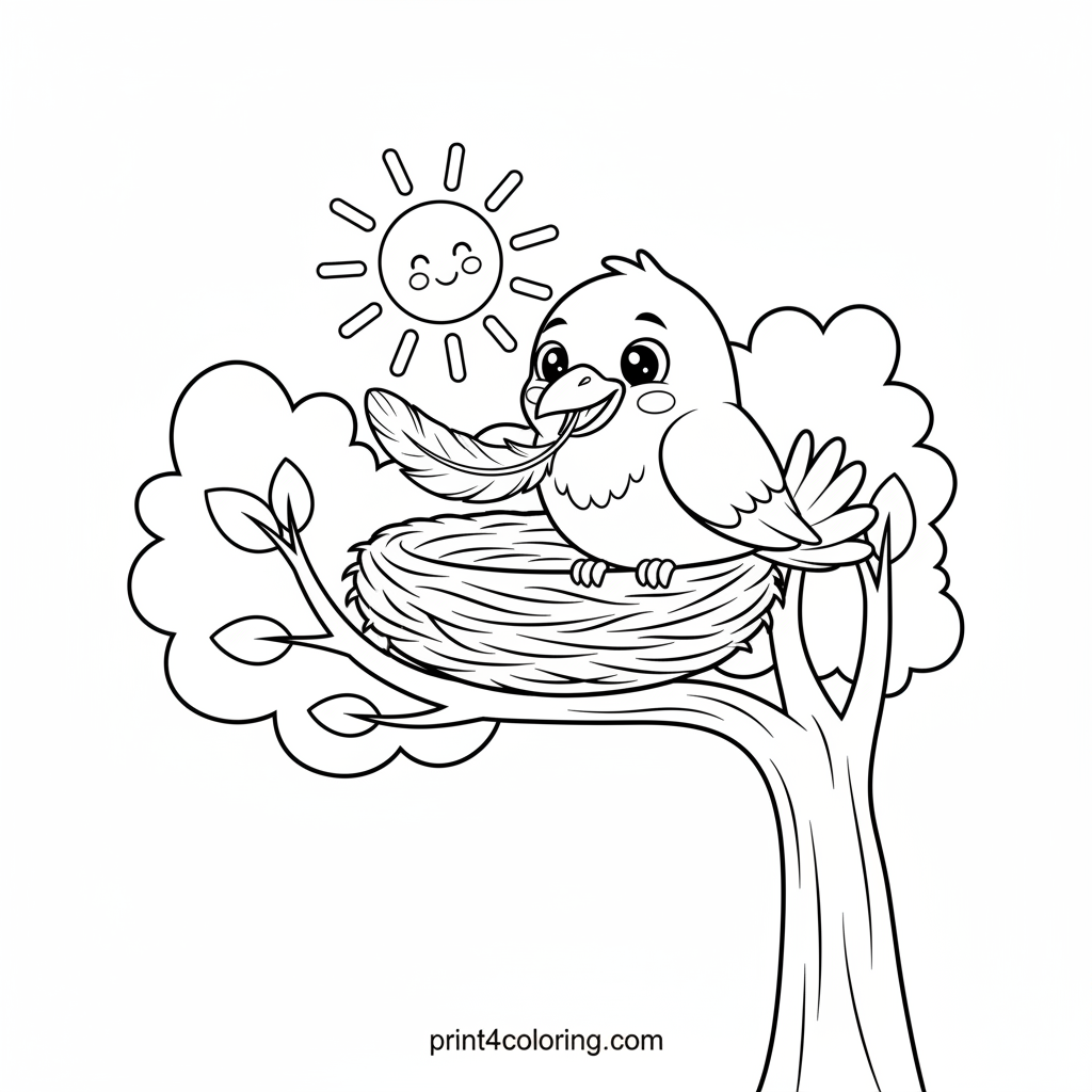 Join a diligent and happy raven as it carefully places a colorful, soft feather into its cozy, round nest. High in a friendly, leafy tree, bathed in warm sunshine, this little bird is busy creating its perfect home. Grab your crayons and bring this heartwarming scene to life with vibrant colors!