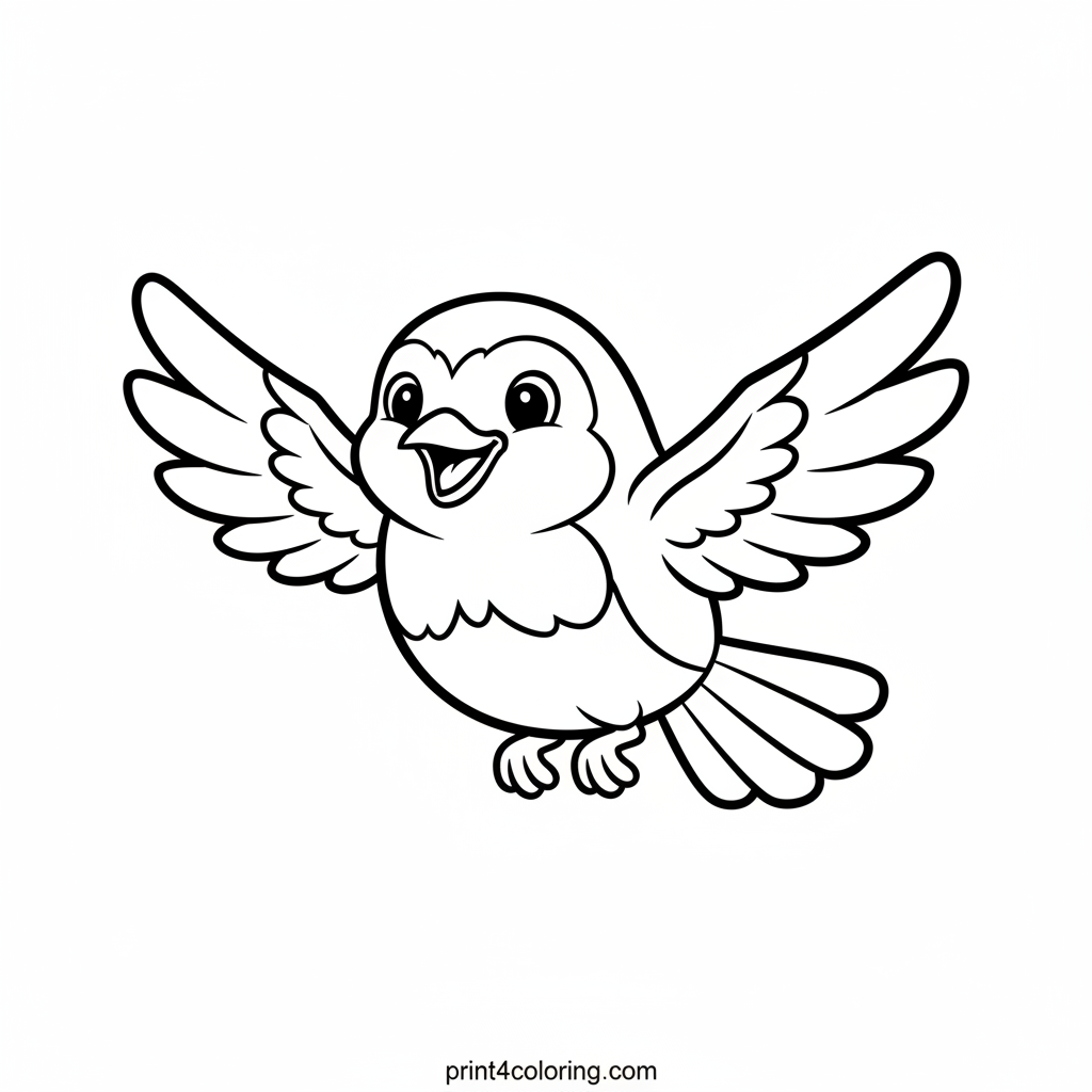 Join our cheerful robin as it spreads its wings wide and takes flight! Imagine the cool breeze and the vast blue sky as this happy bird soars with a big smile. What beautiful colors will you use to make its feathers shine and the sky vibrant? Let your imagination fly with this delightful scene!