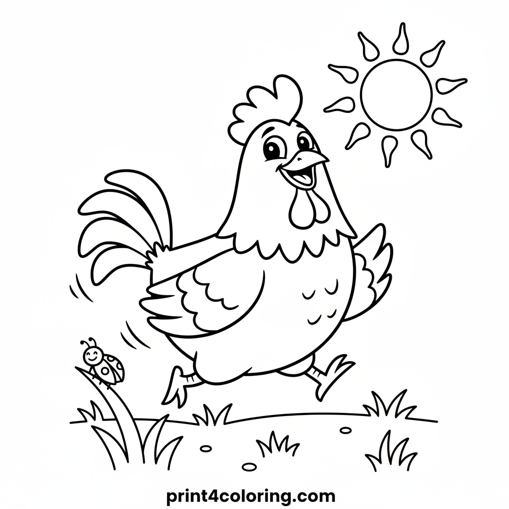 Wake up with our happy rooster as he enjoys a joyful morning run! His feathers are playfully ruffled as he dashes through a bright, sunny, grassy field. Look closely, you might spot a friendly ladybug making its way through the blades of grass. Get ready to add vibrant colors to this cheerful farm scene!