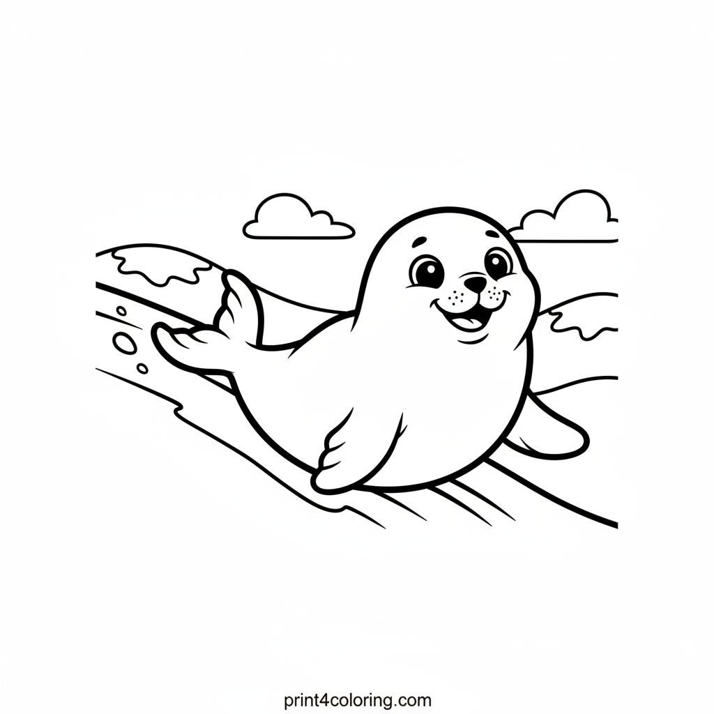 Dive into a delightful winter scene with a happy seal! Watch as it gleefully slides down a gentle, snowy slope, leaving a fun, wavy trail behind. Its flippers are spread wide for balance, showcasing pure joy. This playful friend is ready for your brightest colors and creative flair.