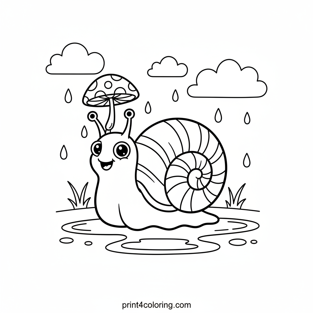 Join a cheerful little snail on a delightful rainy-day adventure! This adorable snail is smiling brightly, using a tiny, polka-dotted mushroom cap as a perfect umbrella. Watch as it happily glides through gentle rain puddles, exploring the wet world with joy. A perfect scene for young artists to color!