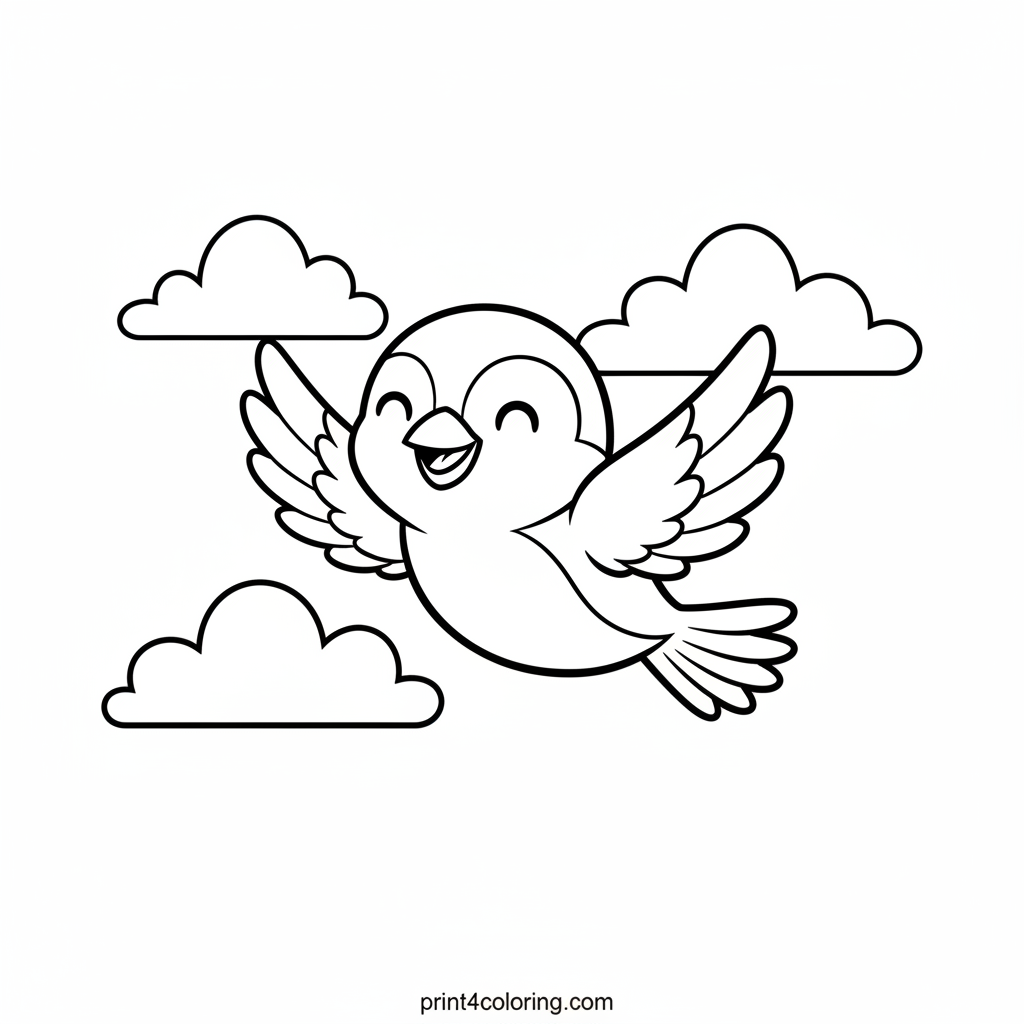Watch this cheerful sparrow as it gracefully takes flight, wings wide open, enjoying the gentle breeze. A few soft clouds drift by in the background, making a beautiful sky for you to color. Imagine the freedom of soaring through the air! Grab your crayons and bring this happy bird to life with your favorite colors.