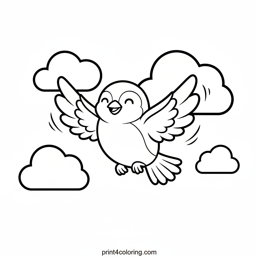 Imagine a cheerful sparrow spreading its wings wide, taking off on a wonderful adventure! This little bird is soaring high, carried by a soft breeze, with fluffy clouds drifting peacefully in the background. Grab your crayons and bring this joyful scene to life with your favorite colors!