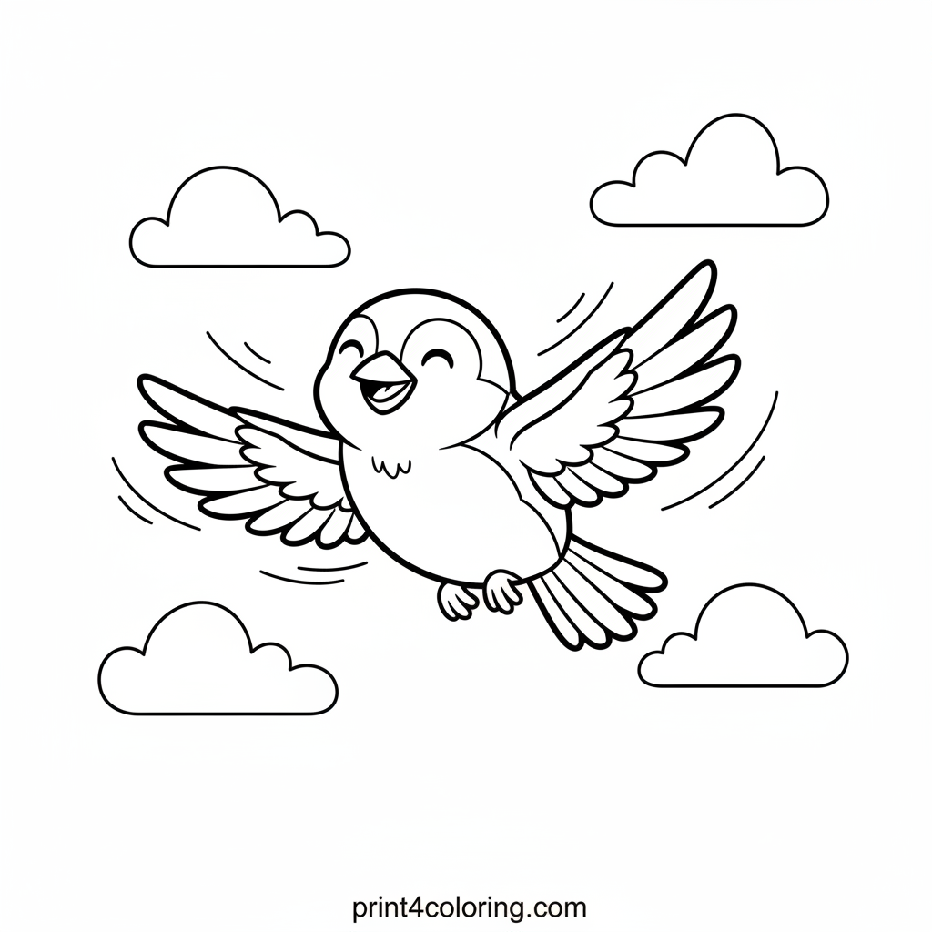 Witness the joy of a happy sparrow taking flight! Its wings are fully spread as it soars gracefully through the air, carried by a gentle breeze. Simple, fluffy clouds dot the background, creating a peaceful scene. Bring this little bird's airborne adventure to life with your colors.