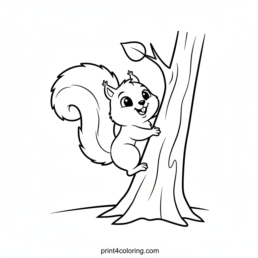 Get ready for a high-energy coloring adventure! This page features a super happy squirrel with a big, bushy tail, mid-climb up a friendly tree trunk. Imagine the squirrel's next big leap to another branch. Use your favorite colors to bring this playful forest friend and its tree to life!