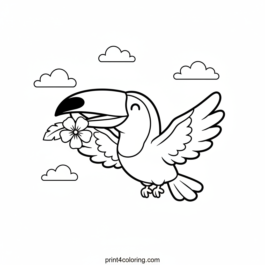 Join our joyful toucan as it gracefully soars through the sky! With wings spread wide and a big smile, this happy bird carries a beautiful tropical flower in its colorful beak. Simple, puffy clouds drift by in the background, making a perfect scene for young artists to bring to life with their favorite colors. Get ready for a high-flying adventure!