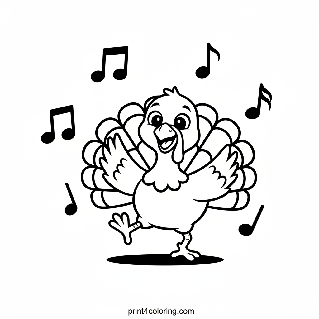 Get ready to color a super happy turkey! This friendly feathered friend has a big smile and is doing a joyful little dance. Caught mid-step with feathers spread playfully, simple musical notes float around, showing how much fun it's having. Grab your crayons and bring this cheerful scene to life!