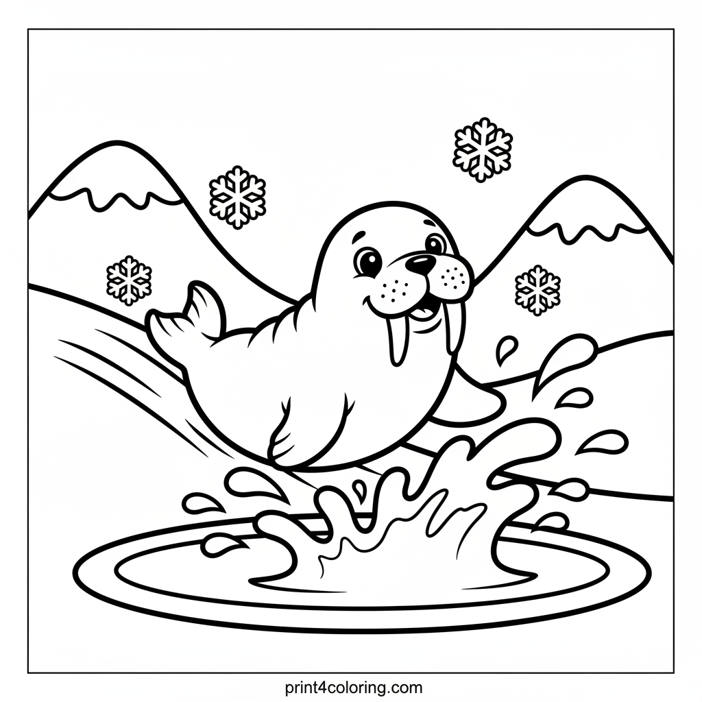 Get ready for a frosty adventure! This delightful coloring page features a happy walrus sliding belly-first down a snowy hill. Watch as it makes a super splash into a calm, blue pool of water. Imagine the chilly fun and vibrant colors you can use to bring this playful arctic scene to life!