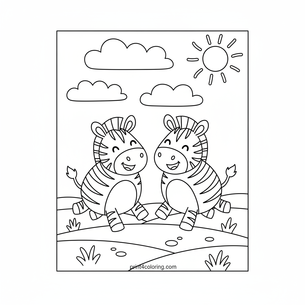 Join two joyful zebras as they gallop with big smiles across the sunny savanna! Watch them race side-by-side under a sky dotted with bouncy clouds. This cheerful scene is perfect for little artists to bring to life with bright colors. Let your imagination run wild with these happy striped friends!