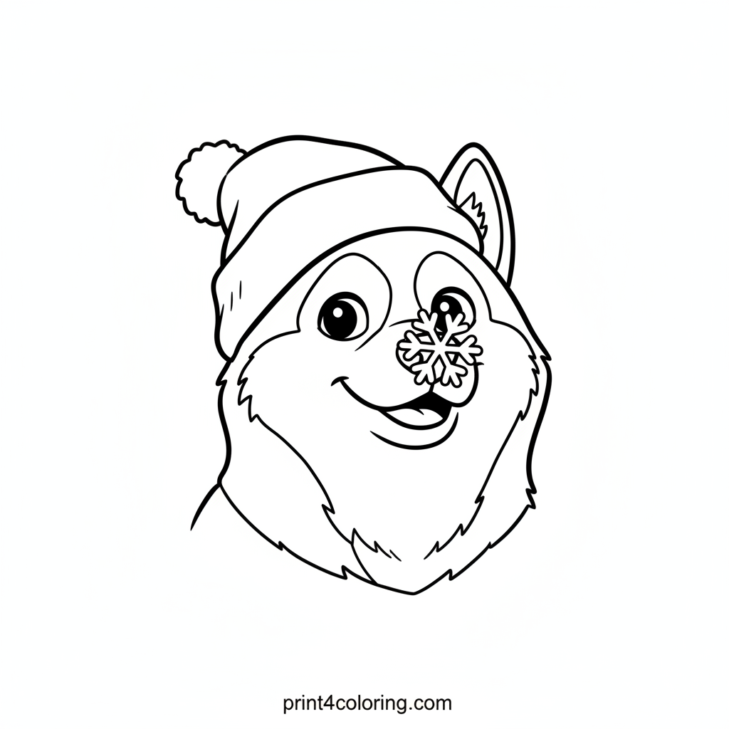 A happy husky wears a giant, floppy snow hat, looking surprised as a snowflake tickles its nose! This cute scene invites young artists to add vibrant colors to the fluffy fur, frosty hat, and playful winter moment. Perfect for a cozy coloring session.