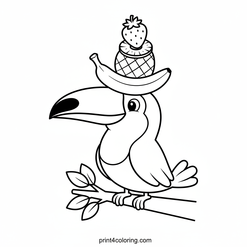 Color a cheerful toucan with a very unique, wobbly hat! This happy bird proudly balances a stack of colorful tropical fruits – a banana, a pineapple slice, and a strawberry – right on its head. Its pleased expression makes this a delightful scene to bring to life with your favorite vibrant colors.