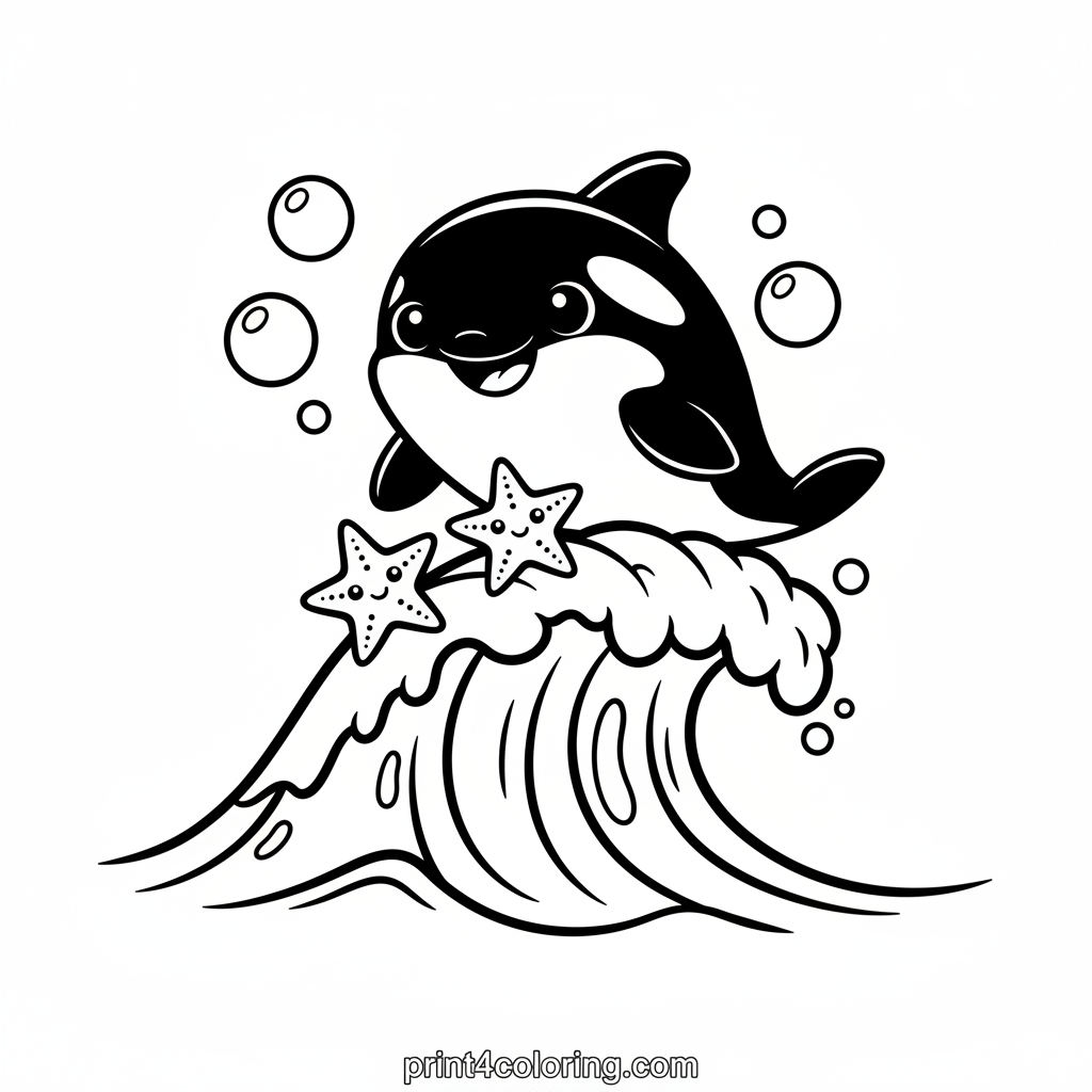 Imagine a sweet baby orca, with big, kind eyes, having the best time riding a gentle ocean wave! A few friendly starfish peek out from the water, cheering on their little whale friend. This adorable scene is perfect for young artists to bring to life with their favorite colors. Dive into an ocean of fun!