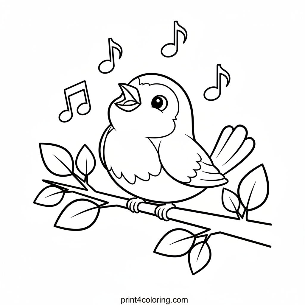 Chirp, chirp! Meet our happy little robin, perched gracefully on a leafy branch. Its head is tilted back, singing a beautiful, joyful song. Simple musical notes float playfully around it, inviting you to add vibrant colors to this sweet scene. Bring this musical moment to life!