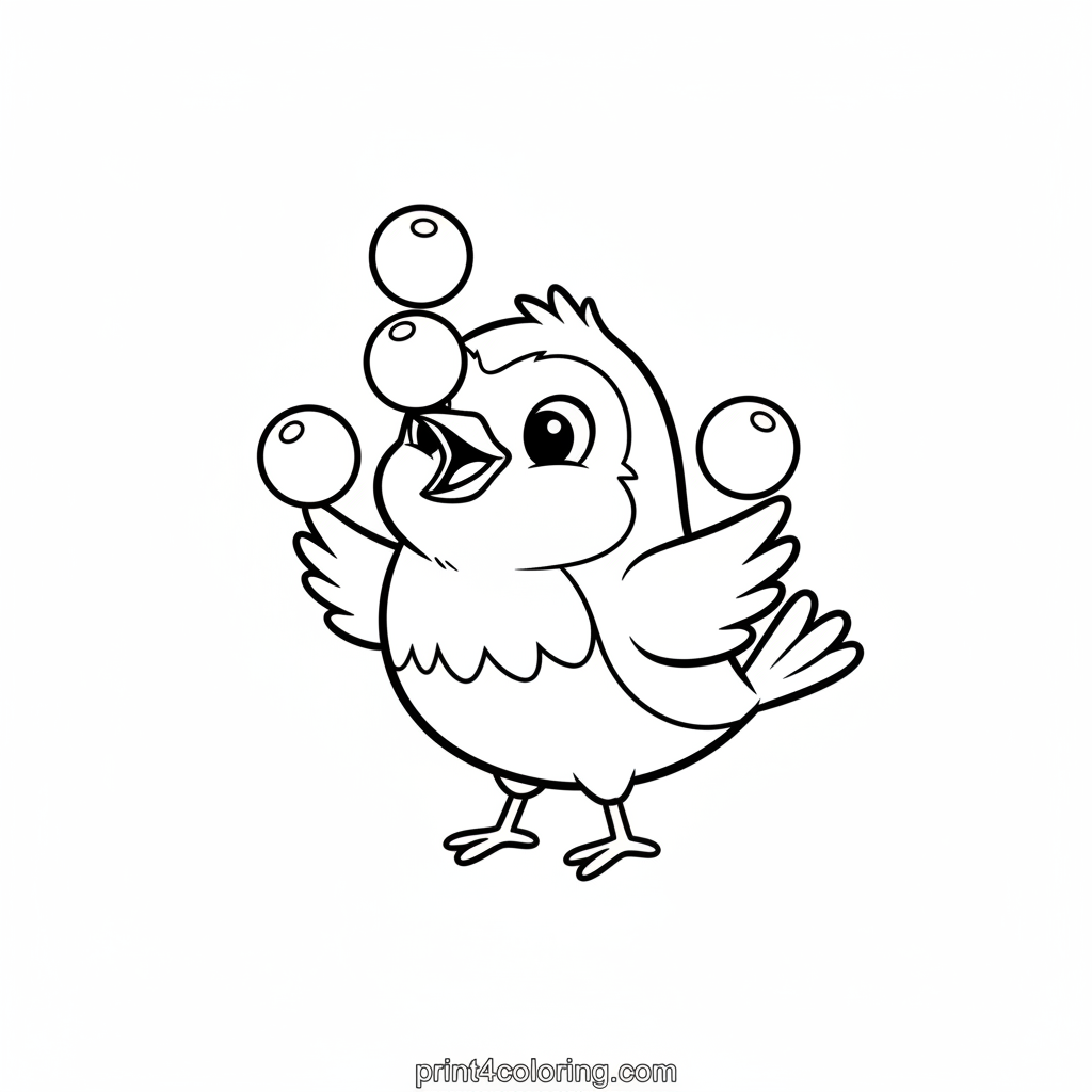 Get ready for some feathered fun! This cheerful robin is having a hilarious time trying to juggle three bright red berries. Watch as it comically balances them with its beak and tiny wings, looking a little clumsy but full of joy. Grab your crayons and bring this playful berry juggling act to life with vibrant colors!
