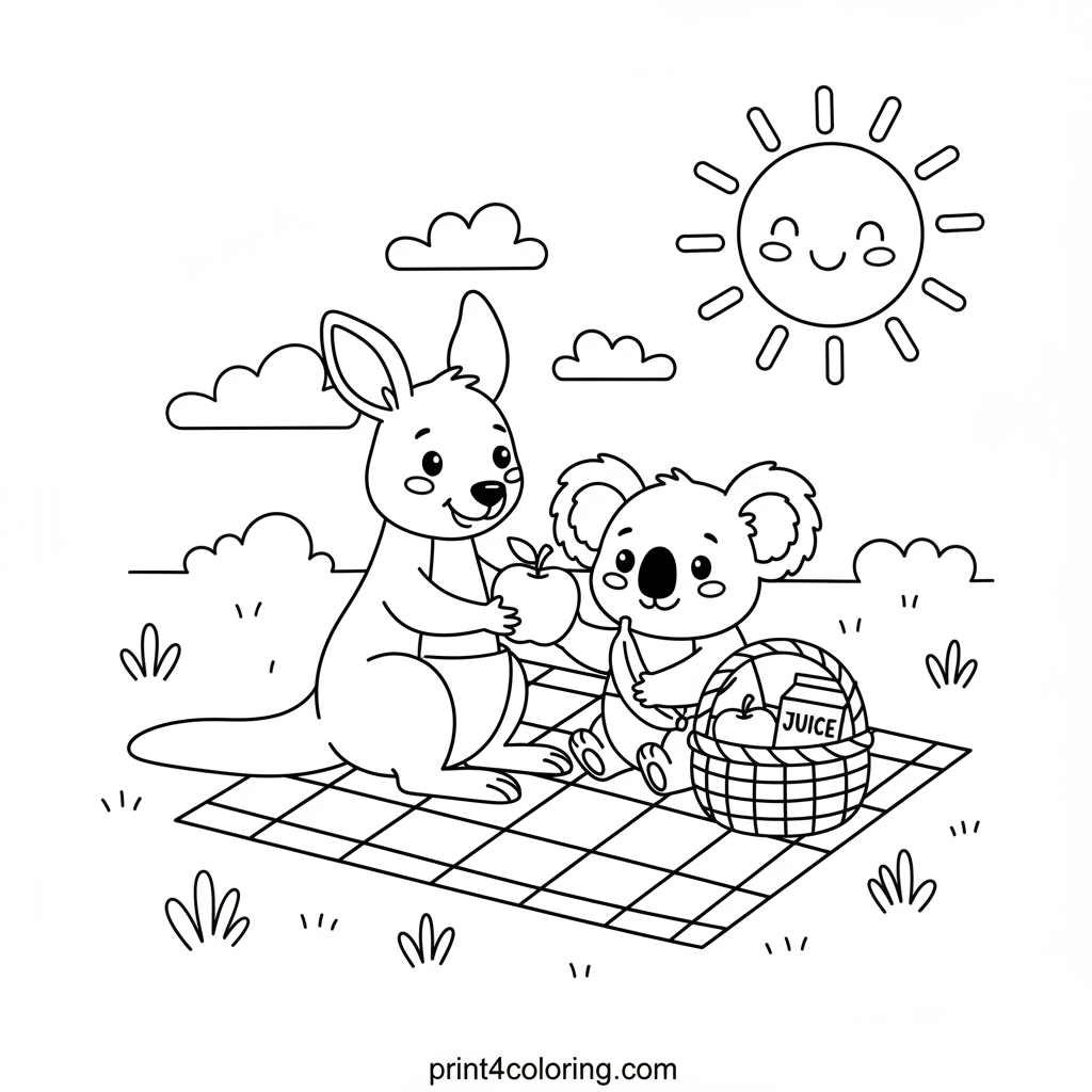Kangaroo and Koala's Sunny Picnic Coloring Page