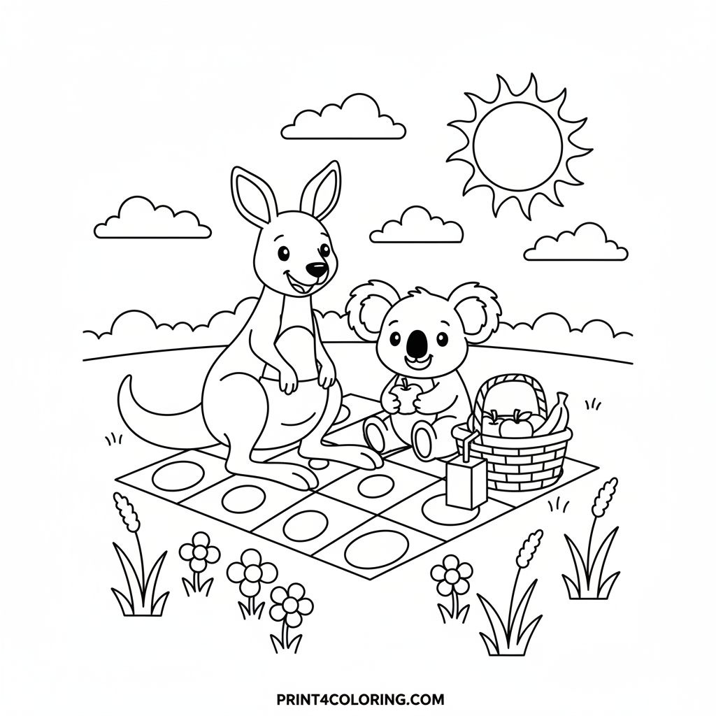 Kangaroo and Koala's Sunny Picnic Coloring Page