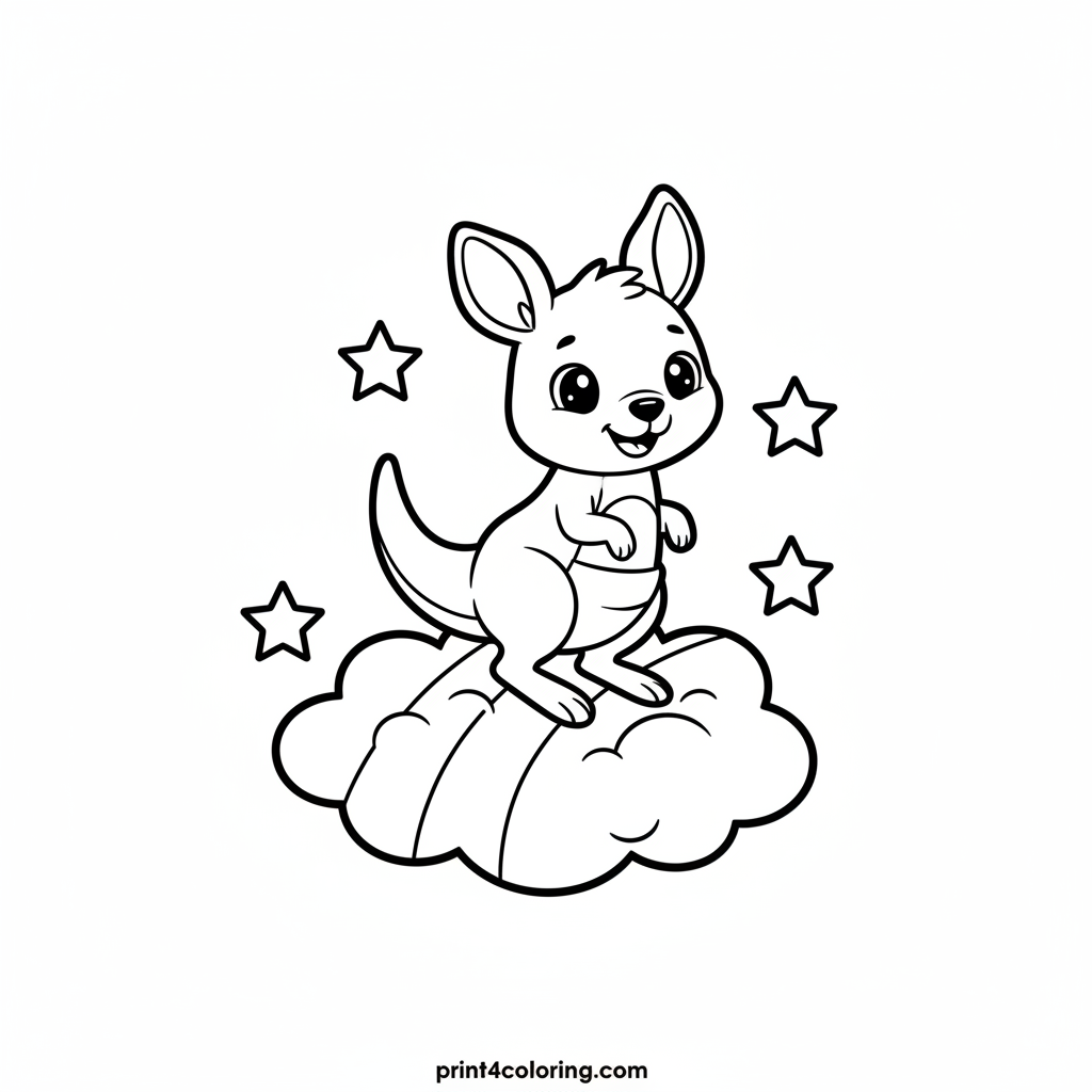 Hop into a magical world with a friendly kangaroo gently bouncing on a fluffy, rainbow-colored cloud! This enchanting scene features simple, twinkling stars all around. It's a joyful picture, perfect for young artists to explore vibrant colors for the cloud and the kangaroo's cozy fur. A dreamy coloring adventure awaits!