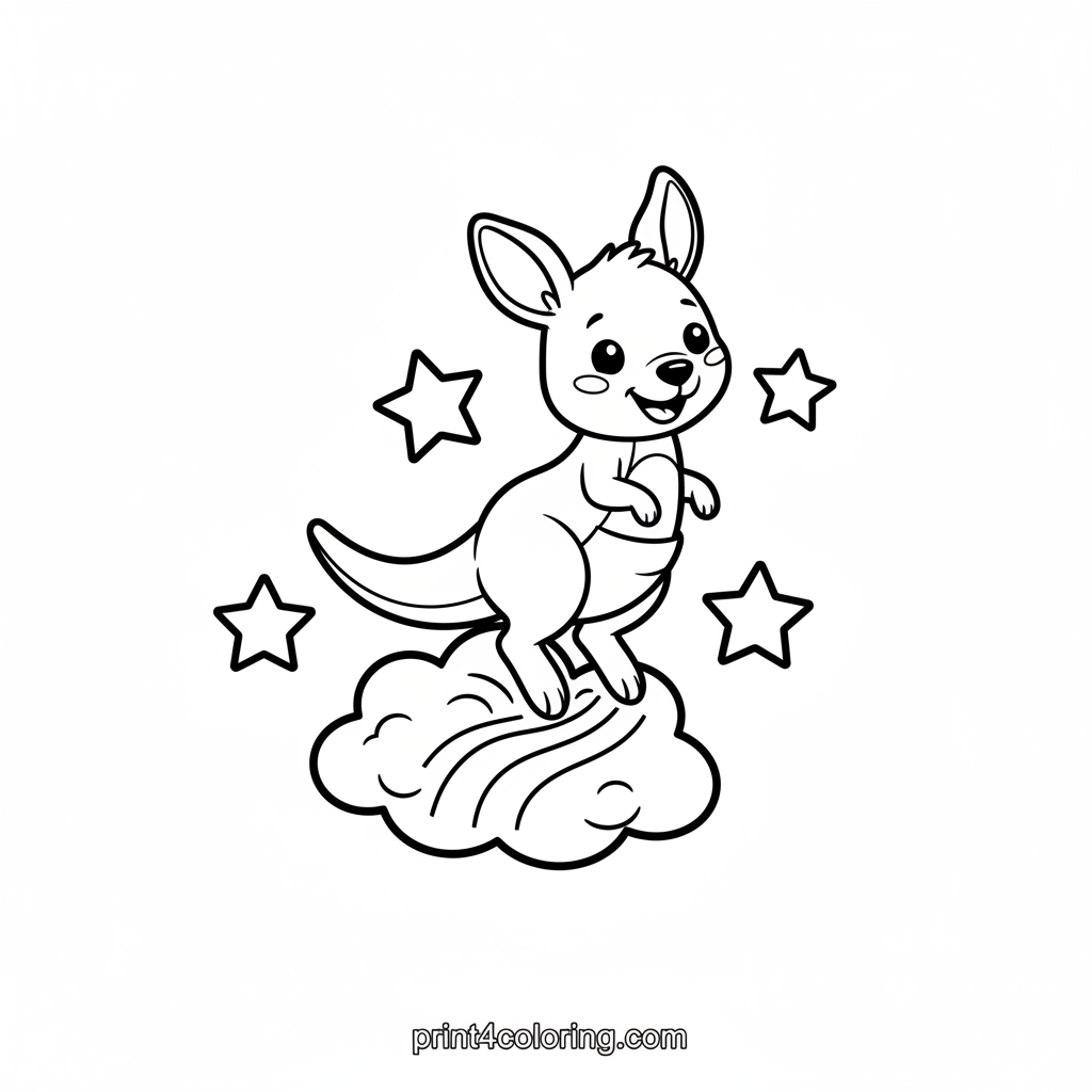 Join a cheerful kangaroo as it enjoys a magical bounce on a soft, fluffy rainbow-colored cloud! This friendly marsupial is surrounded by simple, twinkling stars, making for a dreamy scene high in the sky. Grab your crayons and bring this whimsical airborne adventure to life with all your favorite colors.