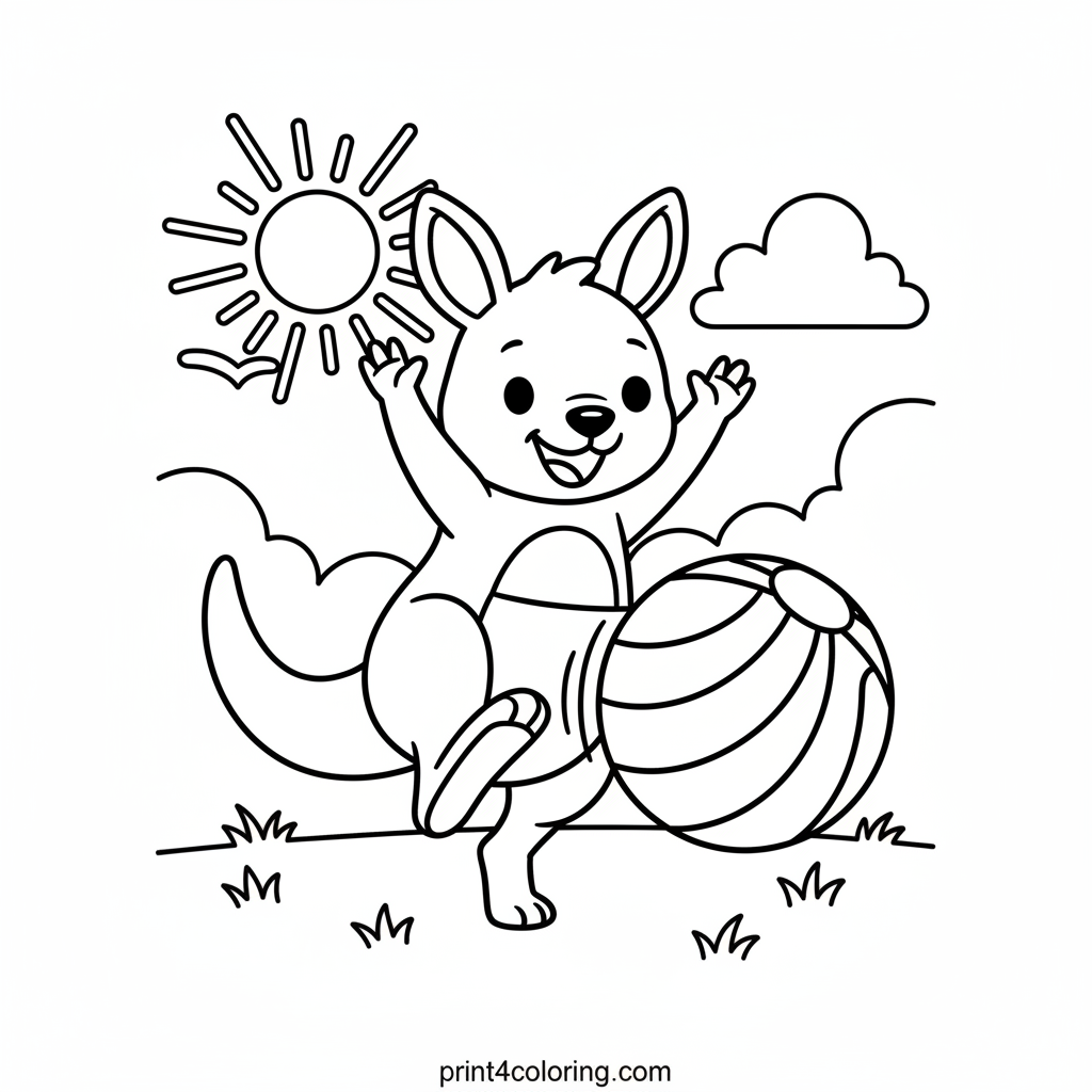 Join a happy kangaroo as it enjoys a sunny day, playfully kicking a big, striped ball across a grassy field! Watch its arms go up in excitement and its face light up with a big smile. Get ready to add vibrant colors to this energetic scene!