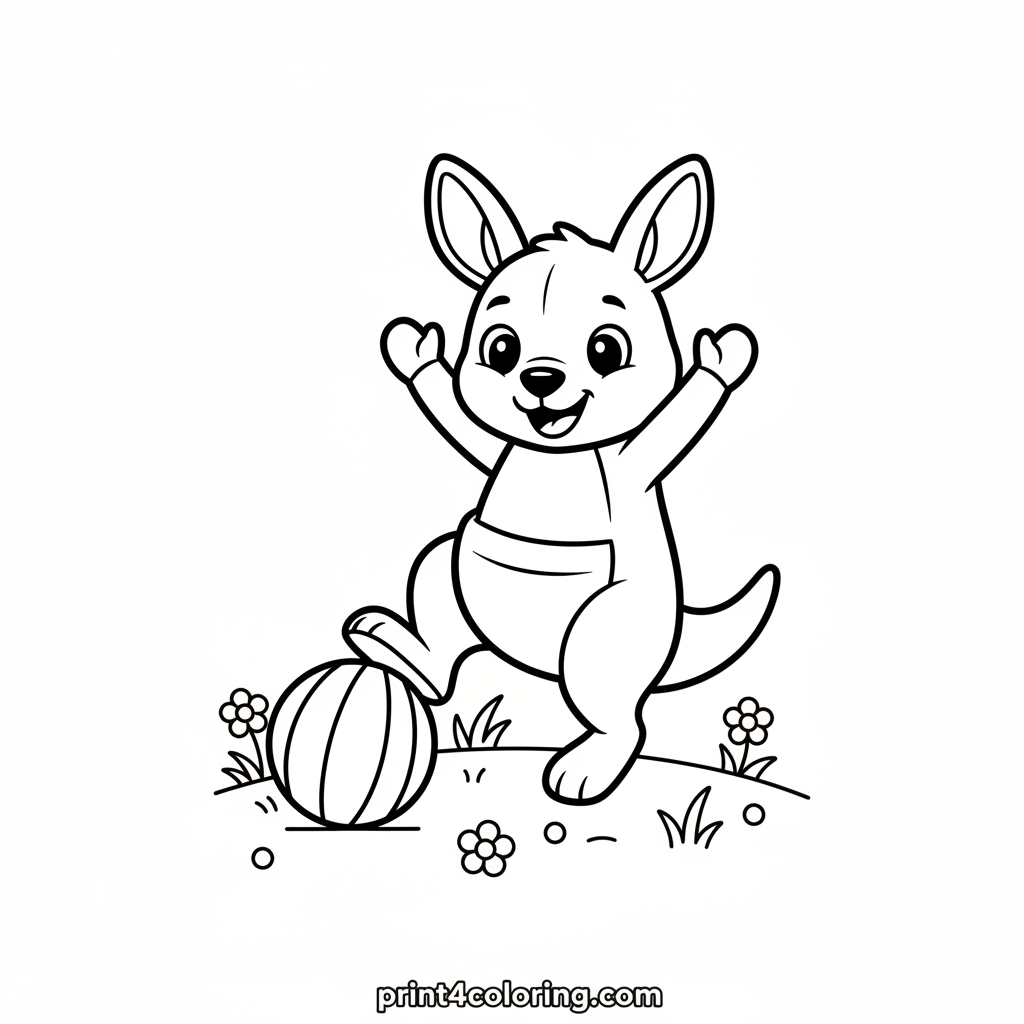 Join our happy kangaroo as it enjoys a sunny day in the grassy field! Watch as it playfully kicks a big, striped ball, its arms up in excitement and a wide smile on its face. This fun scene is perfect for little artists to bring to life with their favorite colors. Get ready for an adventure!