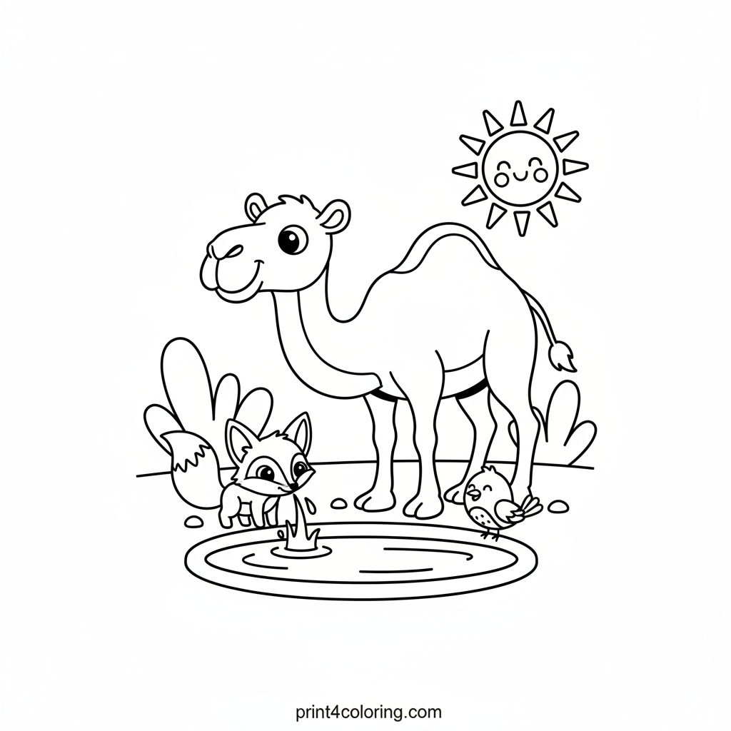Imagine a gentle camel at a sparkling desert pool, bending down to share a refreshing drink. Beside it, a cute desert fox laps up water, while a tiny bird sips nearby. This heartwarming scene shows friendship and kindness in the vast desert. Grab your crayons and bring this peaceful oasis to life!