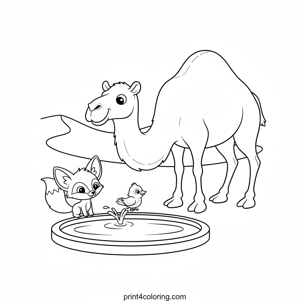 #camel#desert fox#bird#sharing#oasis#kindness#desert animals#water#easy#coloring-page#printable