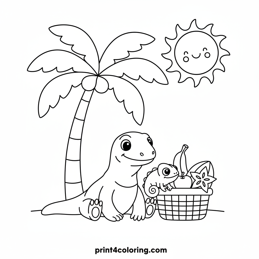 Join a friendly komodo dragon and a tiny, smiling chameleon sharing a basket of colorful, cartoonish fruits! They're enjoying a delightful tropical picnic under a big, sunny palm tree. This heartwarming jungle scene is perfect for little artists to bring to life with their favorite colors.