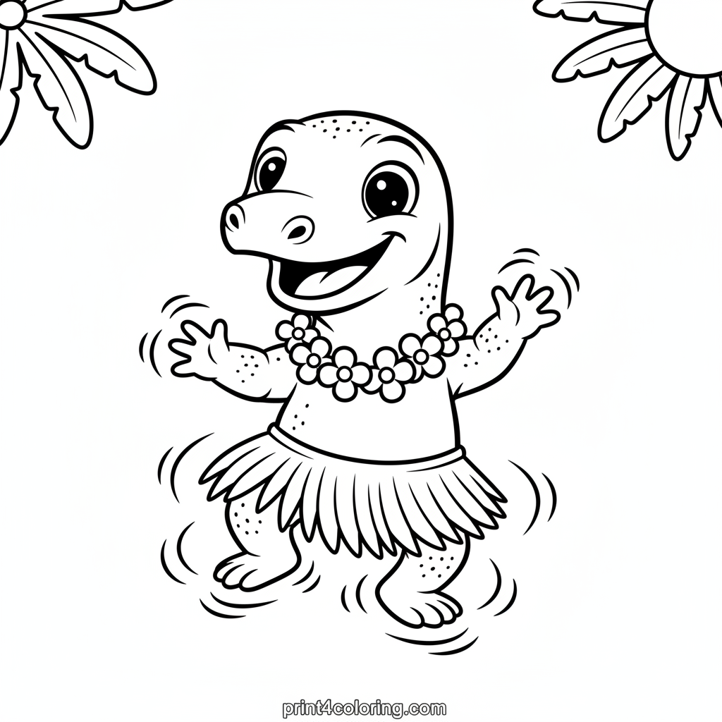 Get ready to groove with our friendly Komodo dragon! He's all dressed up in a vibrant flower lei and a swishy grass skirt, trying out some hilariously wobbly dance moves. Look at that big, happy grin! This silly scene is perfect for a fun coloring adventure.