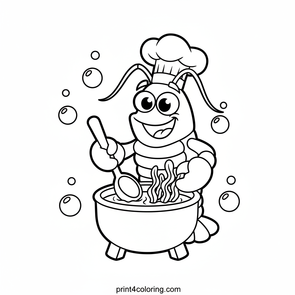 Meet Larry, the silliest chef in the ocean! This goofy lobster wears a tiny, wobbly chef's hat and is busy stirring a pretend pot of colorful seaweed with a giant spoon. Imagine the delicious, imaginary feast he's cooking up! Add vibrant colors to his underwater kitchen adventure.