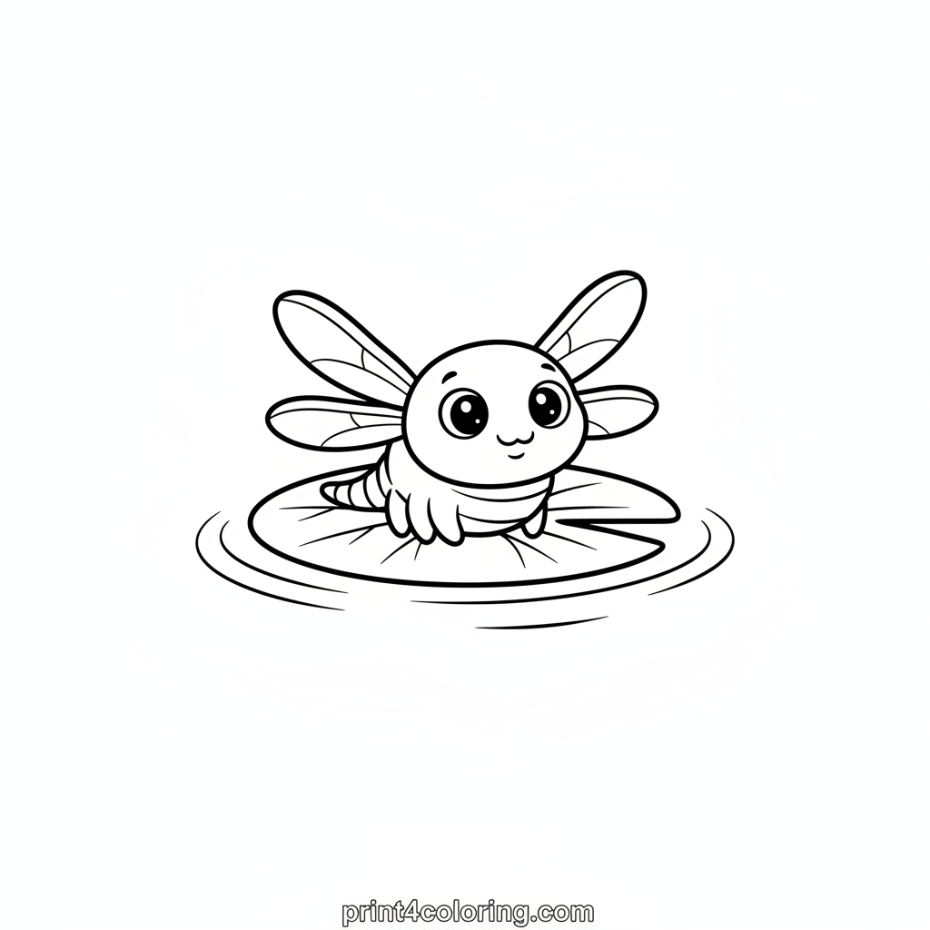 Meet a sweet, plump dragonfly with big, friendly eyes, taking a peaceful rest on a smooth lily pad. This charming scene shows gentle water ripples in a calm pond, inviting you to add vibrant colors. Imagine the quiet joy of nature as you bring this friendly insect to life with your crayons!