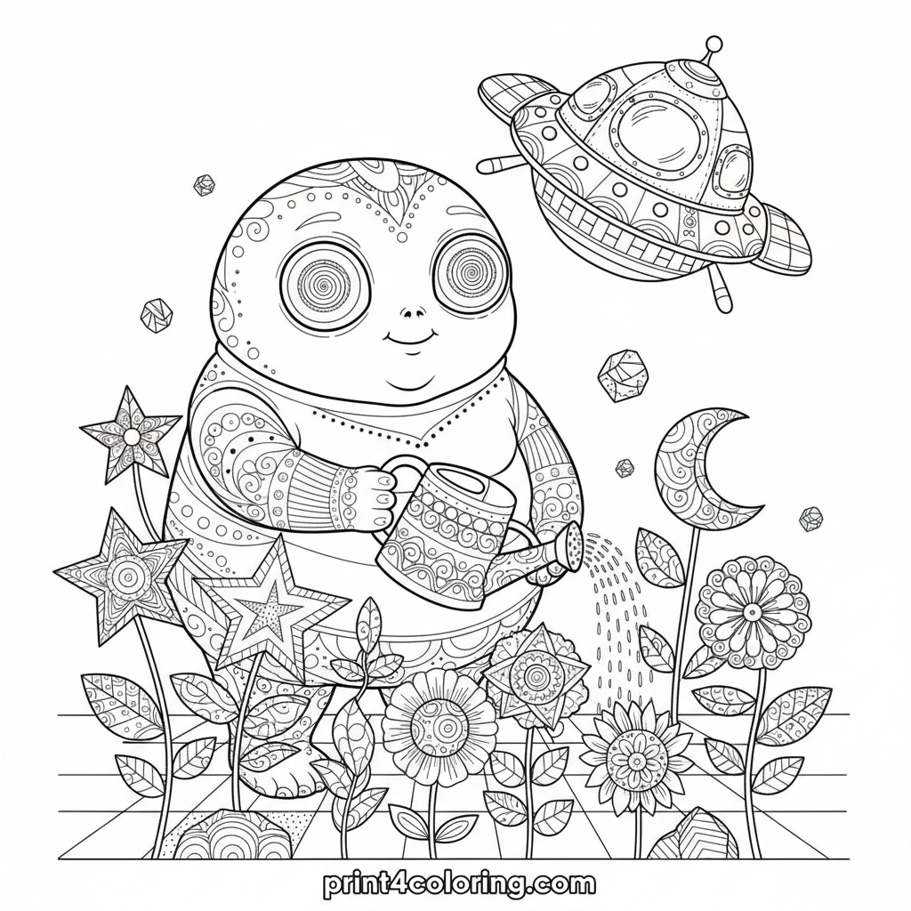 Blast off to a world of wonder with our friendly, chubby alien! This curious creature, with large eyes and intricate skin, is tending a magical 'space garden.' Discover unique, patterned celestial flowers and tiny geometric asteroids. A whimsical spaceship waits in the background, ready for your colorful cosmic adventure!