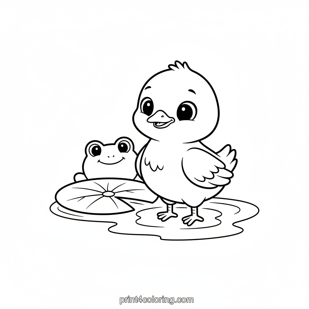 Join a curious baby crane chick as it takes its first splash in a shallow pond. With big, wondering eyes, it explores the water while a friendly frog peeks out from behind a vibrant lily pad. A charming scene ready for your creative colors!