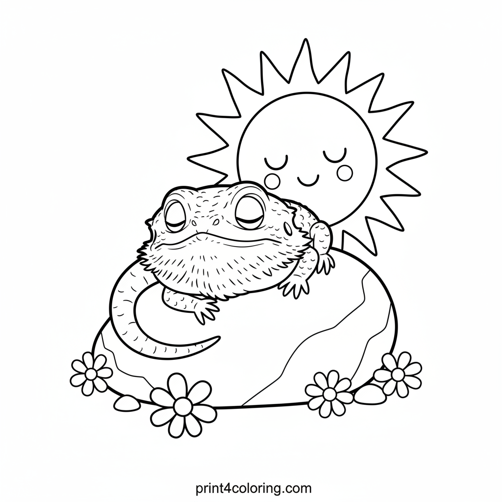 Meet a tiny, happy bearded dragon, taking a peaceful nap on a warm rock! Surrounded by cheerful desert flowers and a friendly, smiling sun, this cozy scene is ready for your artistic touch. Use your imagination to color this adorable desert friend and its sunny siesta!