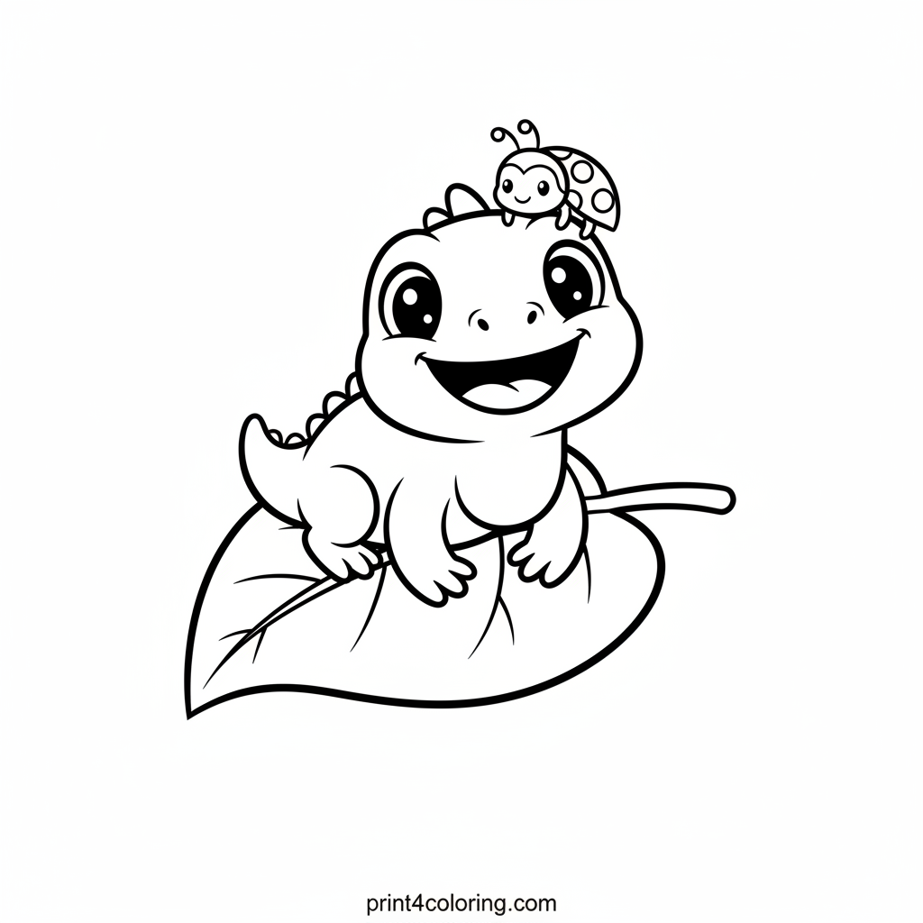 Meet a super happy baby iguana with a huge smile and friendly eyes! This adorable creature sits comfortably on a giant, soft leaf, ready for your vibrant colors. A tiny ladybug friend is playing peek-a-boo from behind the leaf, adding a sweet surprise to this charming scene.