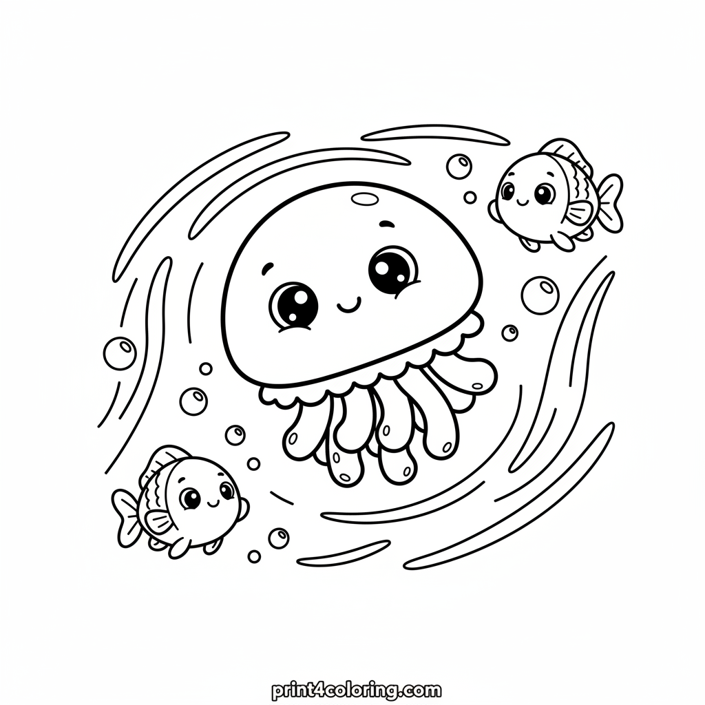 Dive into the deep blue with our adorable baby jellyfish! This super cute, round little friend has big, friendly eyes and tiny, bubbly tentacles, gently drifting through the ocean. Join a few happy fish swimming nearby for a peaceful underwater adventure. Perfect for little artists!