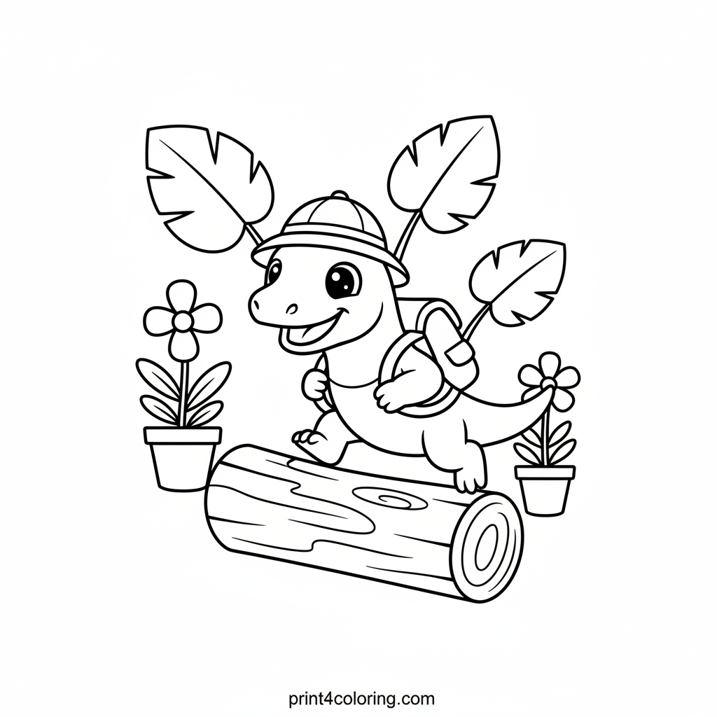 Join our happy little Komodo dragon on an exciting jungle adventure! Wearing a tiny explorer's hat and a small backpack, this friendly dragon carefully steps over a smooth, fallen log. Use your favorite colors to bring this brave explorer and the lush jungle scene to life!