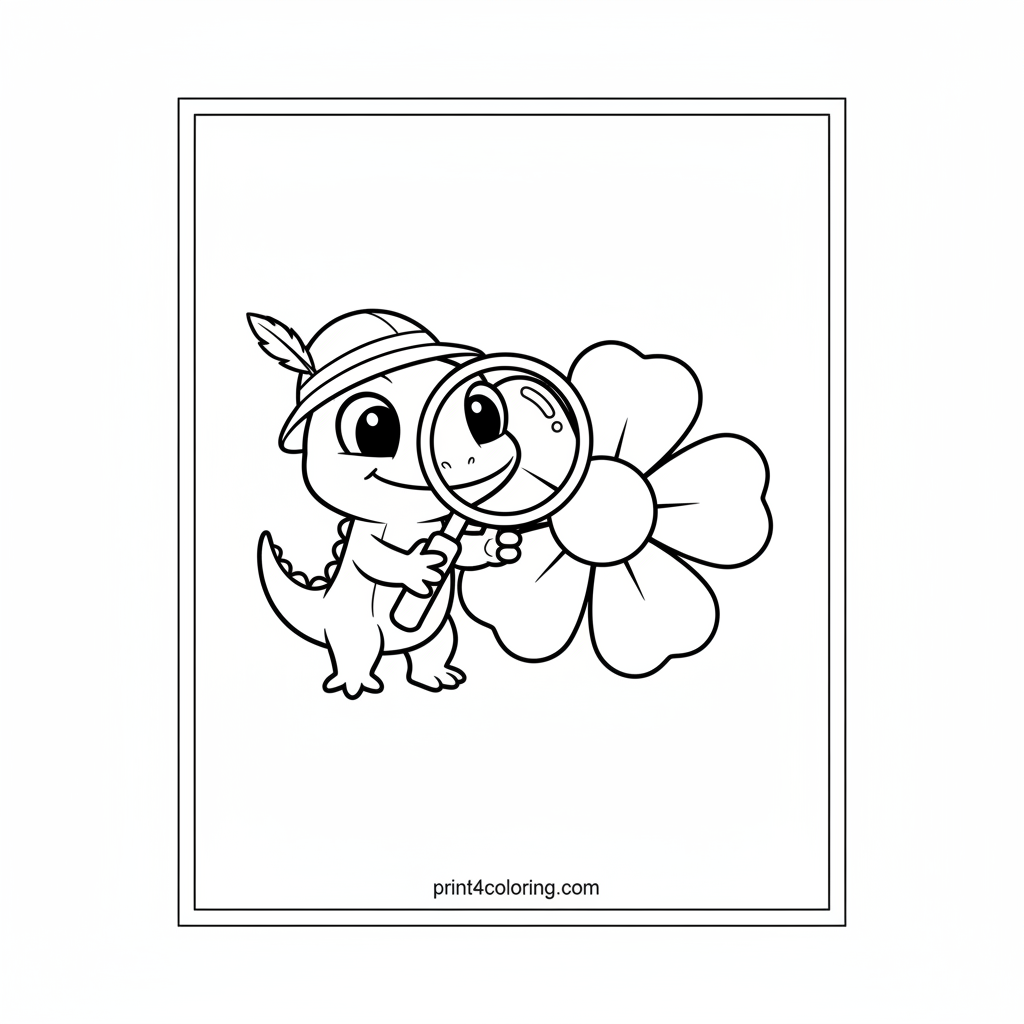 Join a brave little lizard, sporting an adventurer's hat and trusty magnifying glass, as he discovers a magnificent, giant flower! He's excitedly examining its vibrant petals, ready to uncover all its amazing details. Get ready to bring this tiny explorer's big adventure to life with your brightest colors!