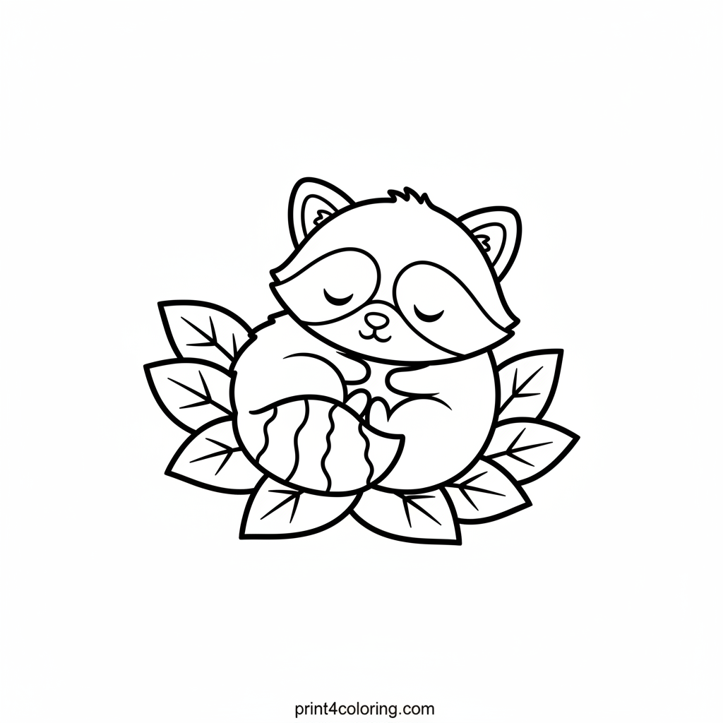 Discover an adorable baby raccoon, fast asleep and snuggled deep in a soft bed of autumn leaves. With its big, sleepy eyes closed and fluffy tail curled, this little kit is dreaming sweetly. A perfect, peaceful scene for young artists to color and bring to life.