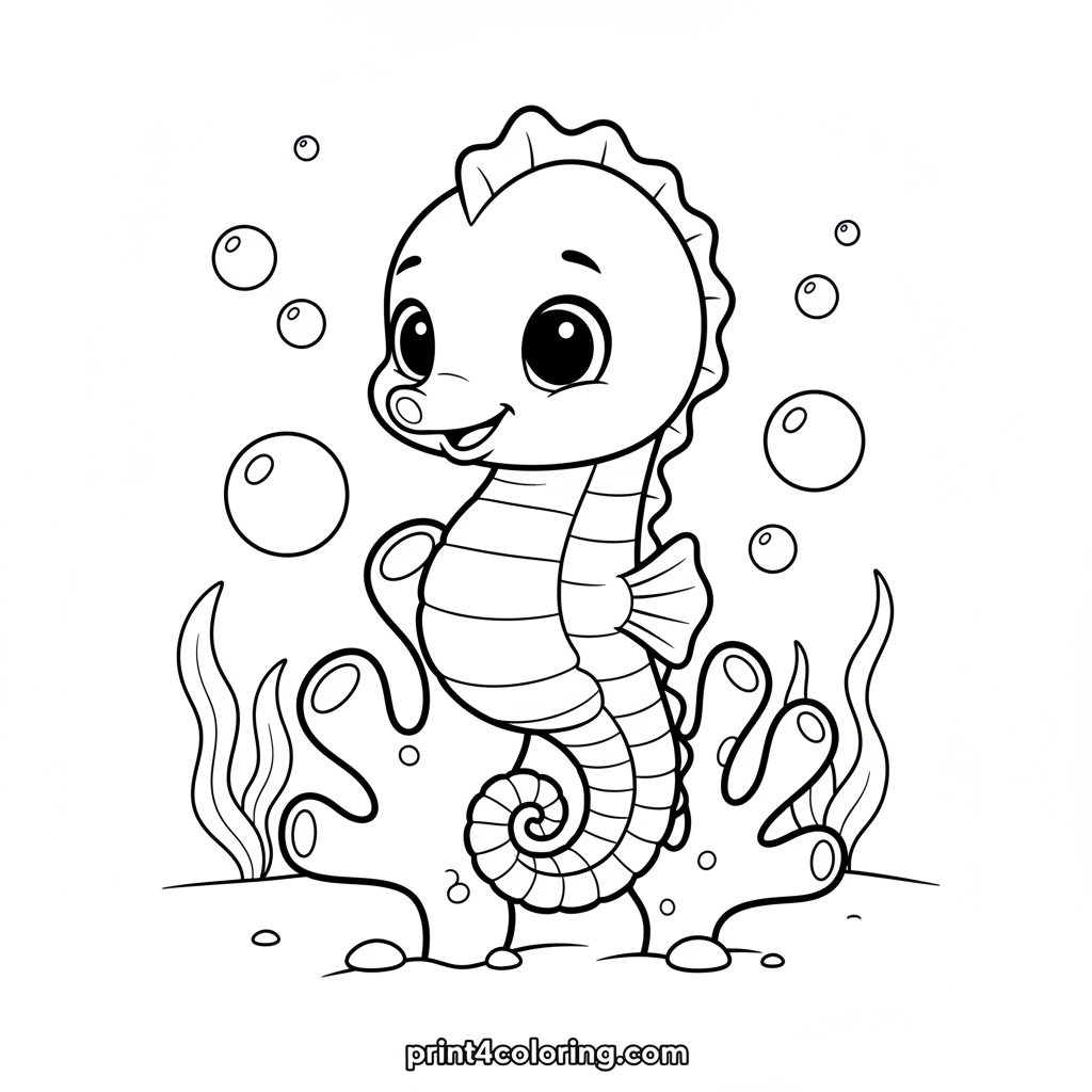 Meet a sweet baby seahorse with big, curious eyes, gently holding onto a wavy piece of coral. Friendly bubbles dance around its cozy underwater home. This delightful scene invites you to imagine soft ocean colors and bring this charming creature to life. Perfect for young artists exploring the wonders of the sea!