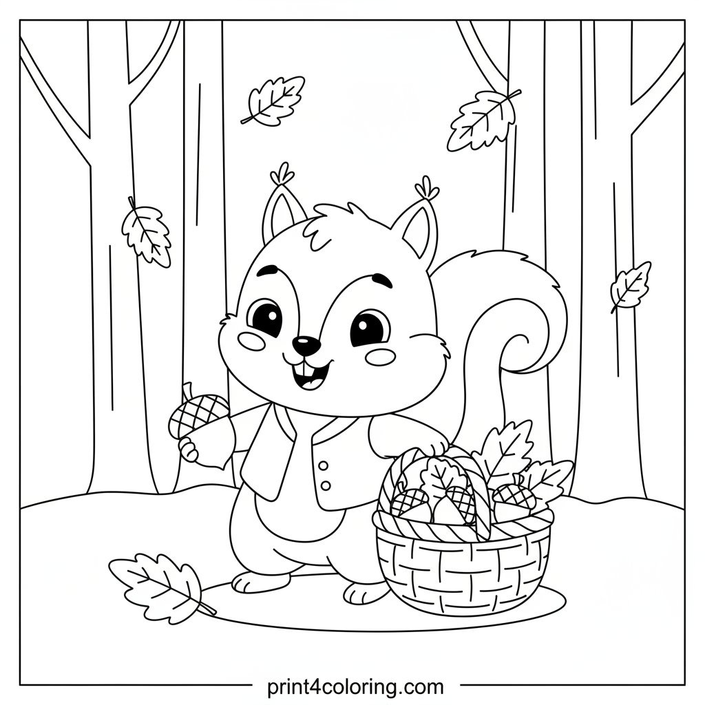 Discover a friendly squirrel busily gathering colorful autumn leaves and plump acorns into a whimsical basket. This industrious woodland helper is preparing for a cozy winter in the happy forest. A delightful scene for young artists to bring to life with warm, vibrant fall colors!